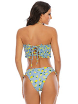 Sweet two pieces shirred bikini set features a strapless bikini swim top with smocked trim, stretchy band with flounce edge, padded cups.Matching with an adjustable side tie bikini bottom with cheeky coverage. Allover in our most-loved lemon printed.